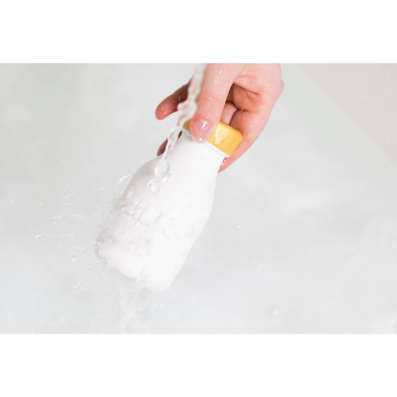 Hold the bottle by its lid under warm running water. Cascading bubbles, brimming with oat milk and Brazilian orange oil, make the most soothing soak.