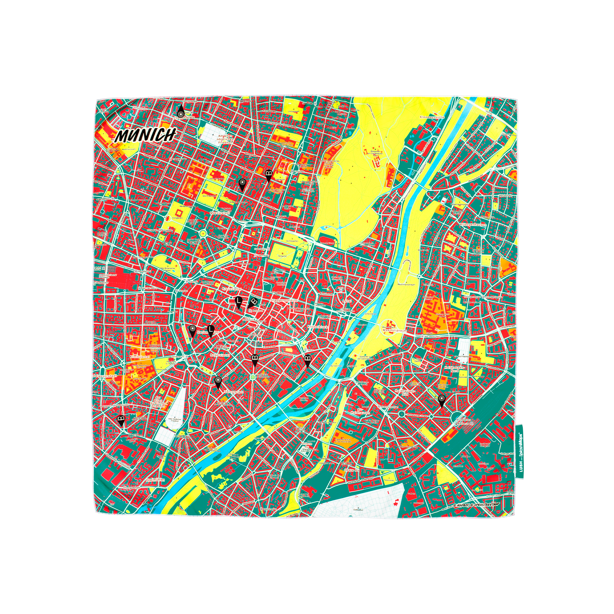 Our LUSH SplashMaps of Vibrant cities around the world are made from SplashMaps’ own SplashTex; a 100% recycled (Global Recycling Standard) polyester which comes from post-consumer bottles sourced within Europe.